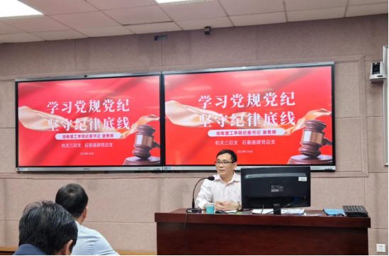 为了深入贯彻中共中央办公厅《关于在全党开展党纪学习教育的通知》精神,进一步提升全体党员干部的纪律意识和规矩意识,4月26日下午,校党委委员、纪委书记、驻校监察专员、二级高级监察官谢贵辉为机关三总支、后勤基建党总支全体党员上党课,三总支书记曾文德主持。
